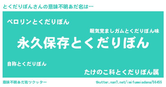 | 男性向けラノベタイトル風あだ名 | 『とくだりぼんという概念が存在しない退屈な世界 』 |