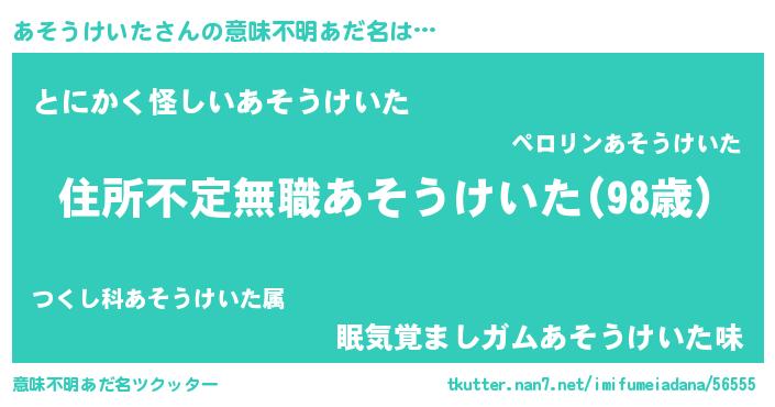 | 男性向けラノベタイトル風あだ名 | 『この素晴らしい世界にあそうけいたを!』 |