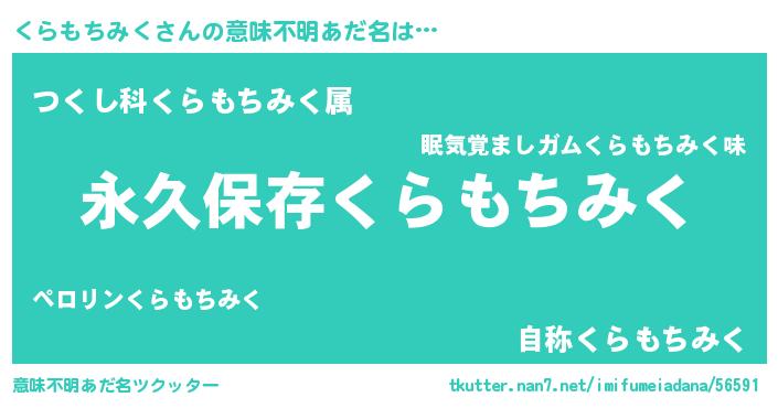 | 女子向けラノベタイトル風あだ名 | 『異世界で失敗しない100のくらもちみく』 |