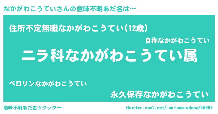 | 男性向けラノベタイトル風あだ名 | 『なかがわこうてい~年齢イコール彼女いない歴の魔法使い~』 |