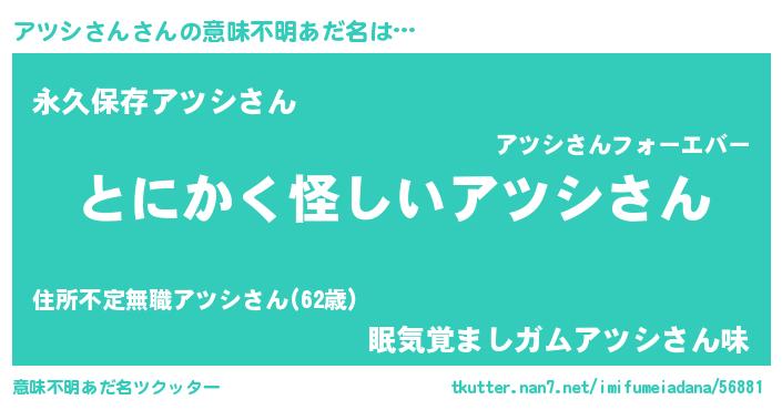 | 女子向けラノベタイトル風あだ名 | 『アツシさんの卵を拾いまして』 |