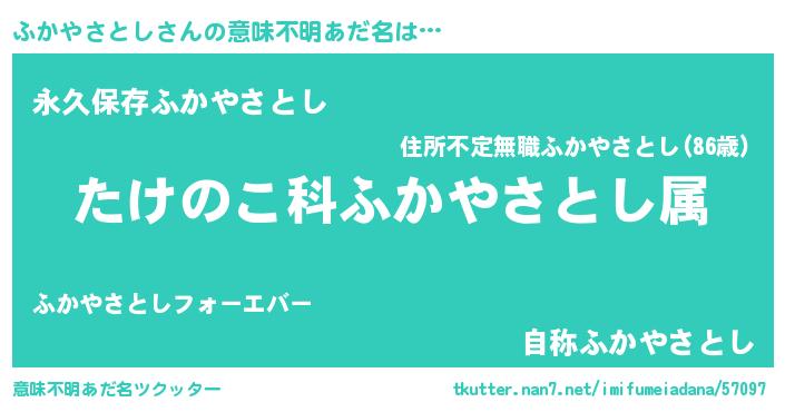 | 男性向けラノベタイトル風あだ名 | 『転生したらふかやさとしだった件』 |