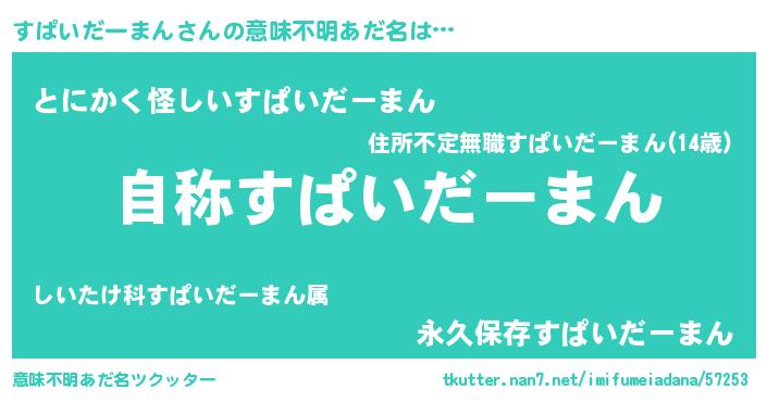 | 男性向けラノベタイトル風あだ名 | 『Re:すぱいだーまんから始める異世界生活』 |