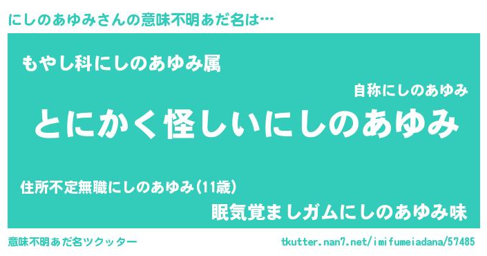 | 男性向けラノベタイトル風あだ名 | 『にしのあゆみの嫁は女の子じゃないと思った?』 |