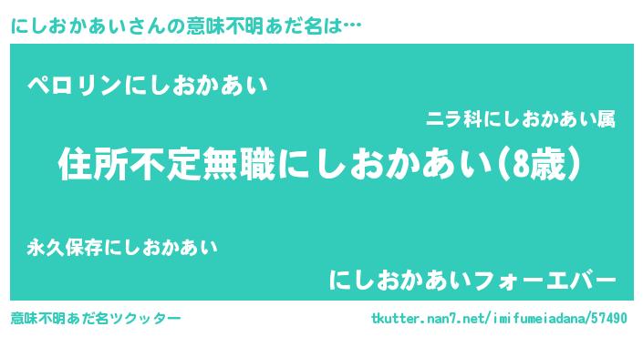 | 女子向けラノベタイトル風あだ名 | 『にしおかあいが死なない童話 林檎のにしおかあいの診療簿』 |