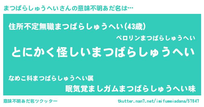 | 男性向けラノベタイトル風あだ名 | 『うちのまつばらしゅうへいが世界を掌握している!』 |