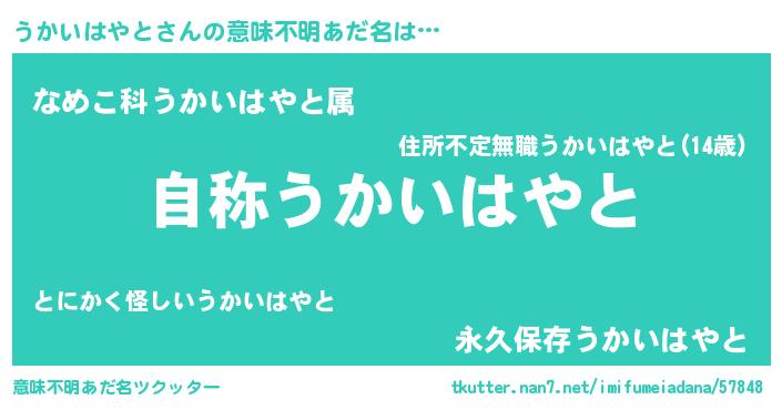 | ヘコむあだ名 | 『うかいはやと(小並感)』『うかを』 |