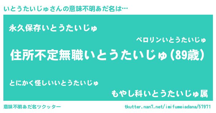 | 男性向けラノベタイトル風あだ名 | 『この素晴らしい世界にいとうたいじゅを!』 |