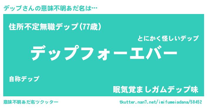 | 女子向けラノベタイトル風あだ名 | 『デップ伯爵の花嫁』『死神デップの再婚』 |