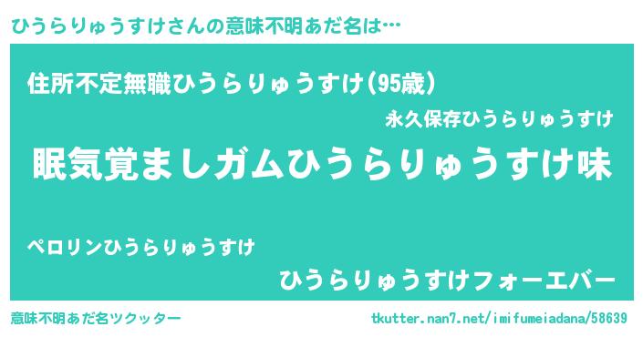 | 男性向けラノベタイトル風あだ名 | 『おまえをオタクにしてやるから、俺をひうらりゅうすけにしてくれ! 』 |