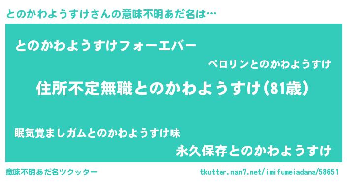 | 男性向けラノベタイトル風あだ名 | 『うちのとのかわようすけが世界を掌握している!』 |