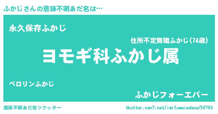 | 男性向けラノベタイトル風あだ名 | 『ふかじ~年齢イコール彼女いない歴の魔法使い~』 |