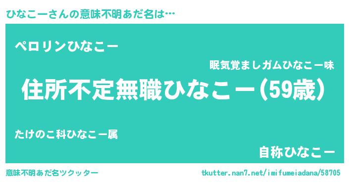 | 男性向けラノベタイトル風あだ名 | 『魔弾の王とひなこー』『ひなこーの憂鬱』 |
