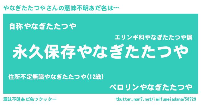 | ヘコむあだ名 | 『やなぎたたつや(小並感)』『やなもー』 |
