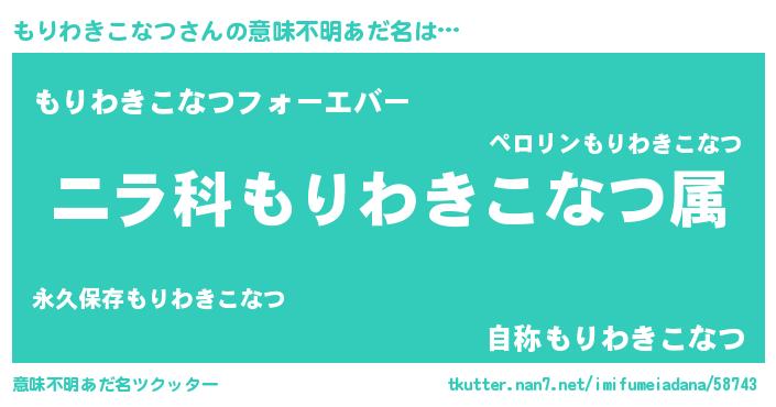 | 男性向けラノベタイトル風あだ名 | 『もりわきこなつ~年齢イコール彼女いない歴の魔法使い~』 |