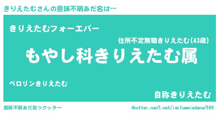 | 男性向けラノベタイトル風あだ名 | 『きりえたむに滅ぼされるだけの簡単なお仕事です』 |