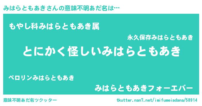 | 男性向けラノベタイトル風あだ名 | 『みはらともあきの嫁は女の子じゃないと思った?』 |