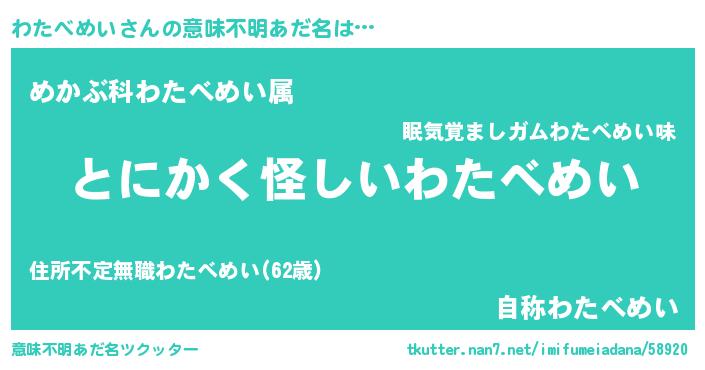 | 男性向けラノベタイトル風あだ名 | 『わたべめいの嫁は女の子じゃないと思った?』 |