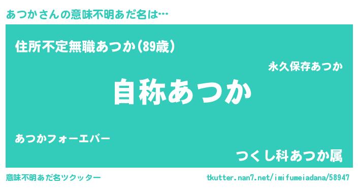 | 男性向けラノベタイトル風あだ名 | 『あつかに滅ぼされるだけの簡単なお仕事です』 |