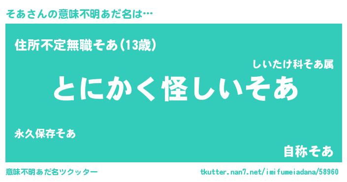 | ヘコむあだ名 | 『そあぷりん』『そあ(笑)』『つくし』 |
