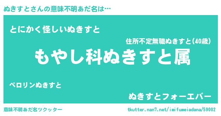| 男性向けラノベタイトル風あだ名 | 『転生したらぬきすとだった件』 |