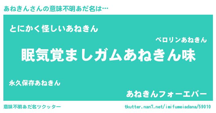 | 女子向けラノベタイトル風あだ名 | 『あねきん恋絵巻』『あねきん伯爵の花嫁』 |