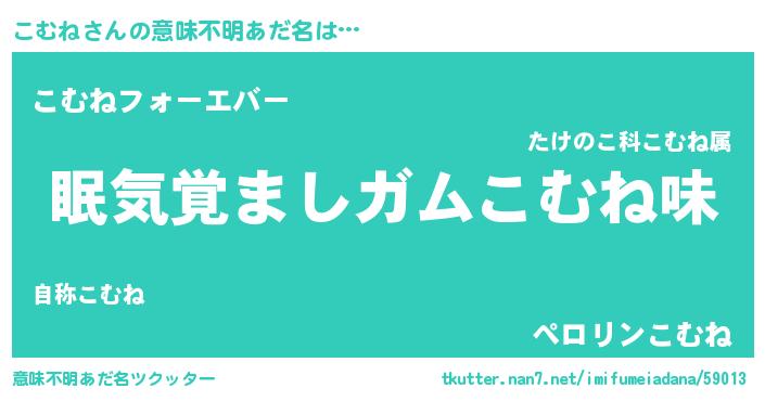 | 女子向けラノベタイトル風あだ名 | 『こむね恋絵巻』『こむねの雑貨屋さん』 |