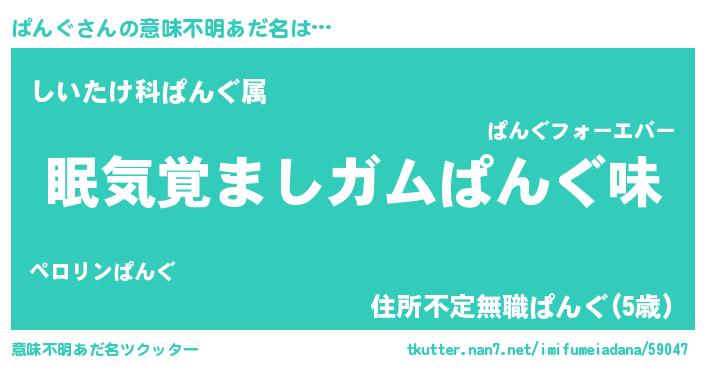 | ヒーロー風カッコイイあだ名 | 『慈愛の使者ぱんぐ』『仮面パンダー』 |