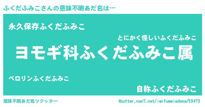 | 男性向けラノベタイトル風あだ名 | 『ふくだふみこ~年齢イコール彼女いない歴の魔法使い~』 |