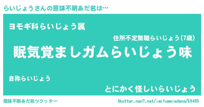 | 男性向けラノベタイトル風あだ名 | 『らいじょうに滅ぼされるだけの簡単なお仕事です』 |