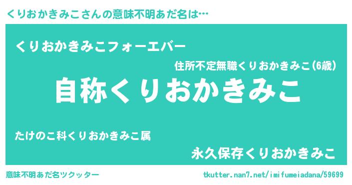 | 男性向けラノベタイトル風あだ名 | 『Re:くりおかきみこから始める異世界生活』 |