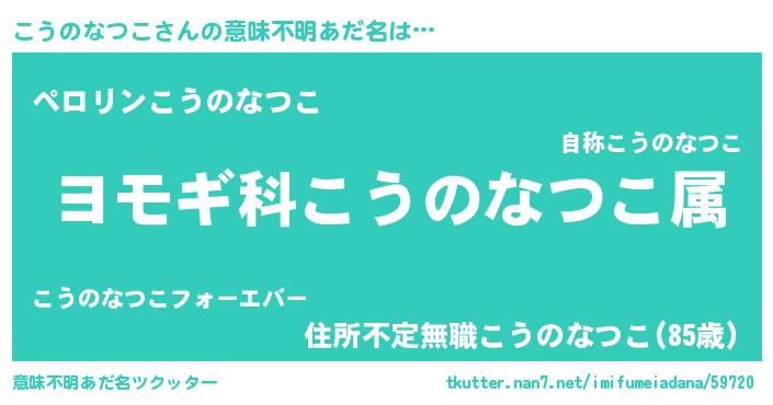 | 男性向けラノベタイトル風あだ名 | 『こうのなつこ~年齢イコール彼女いない歴の魔法使い~』 |
