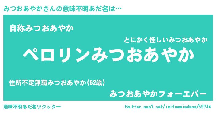| 男性向けラノベタイトル風あだ名 | 『ミツオアヤカアートオンライン』 |