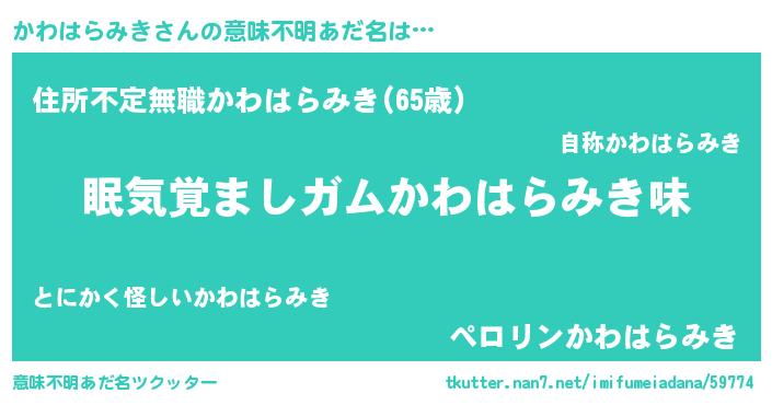 | 男性向けラノベタイトル風あだ名 | 『おまえをオタクにしてやるから、俺をかわはらみきにしてくれ! 』 |
