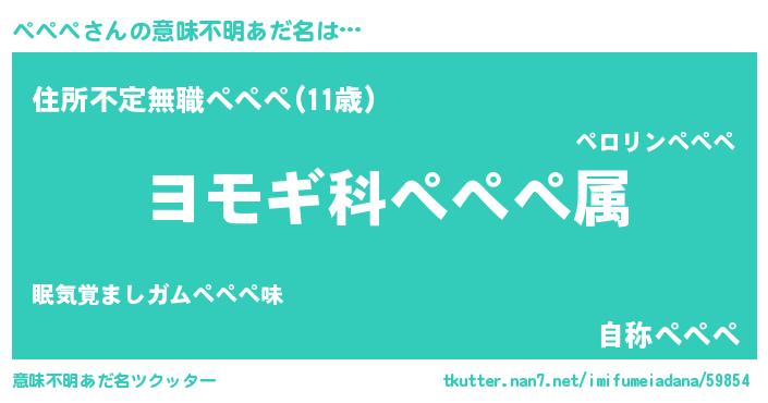 | 男性向けラノベタイトル風あだ名 | 『ぺぺぺ~年齢イコール彼女いない歴の魔法使い~』 |