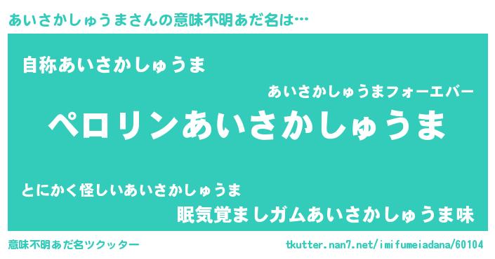 | 男性向けラノベタイトル風あだ名 | 『あいさかしゅうまの憂鬱』 |