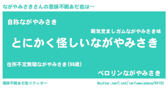 | 男性向けラノベタイトル風あだ名 | 『ながやみさきの嫁は女の子じゃないと思った?』 |