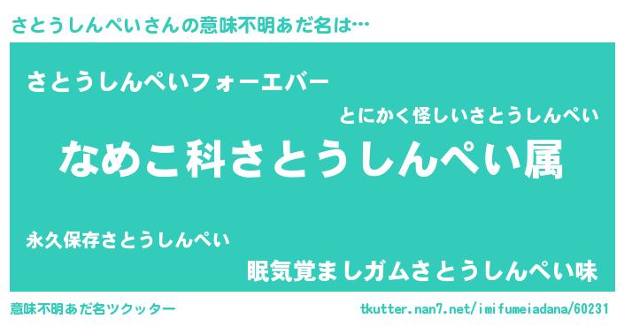 | 男性向けラノベタイトル風あだ名 | 『転生したらさとうしんぺいだった件』 |