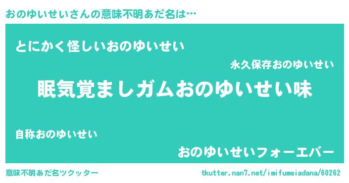 | 男性向けラノベタイトル風あだ名 | 『ノーゲーム・ノーオノユイセイ』 |