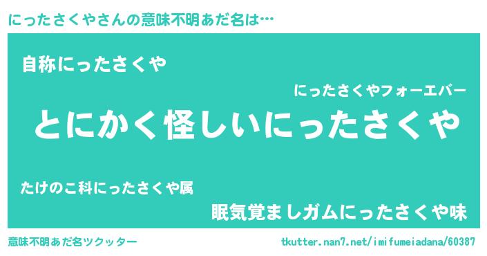 | 男性向けラノベタイトル風あだ名 | 『にったさくやの嫁は女の子じゃないと思った?』 |