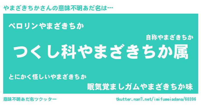 | 男性向けラノベタイトル風あだ名 | 『やまざきちか~年齢イコール彼女いない歴の魔法使い~』 |