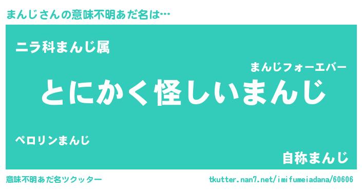 | 女子向けラノベタイトル風あだ名 | 『まんじの卵を拾いまして』 |