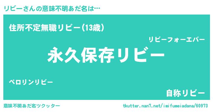 | 男性向けラノベタイトル風あだ名 | 『リビーという概念が存在しない退屈な世界 』 |