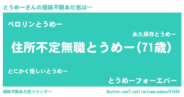 | ヒーロー風カッコイイあだ名 | 『仮面トウダー』『スーパートウメー』 |