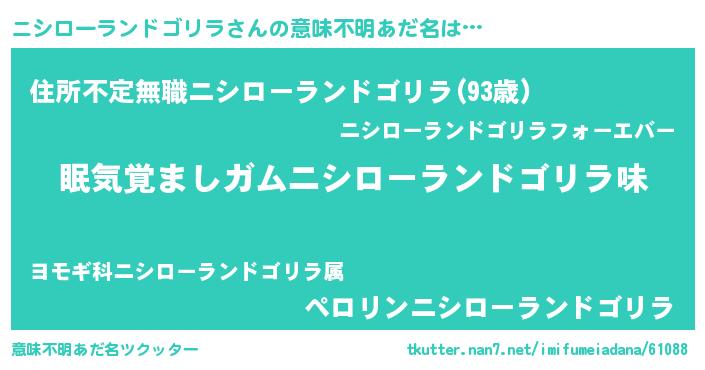 | 男性向けラノベタイトル風あだ名 | 『うちのニシローランドゴリラが世界を掌握している!』 |