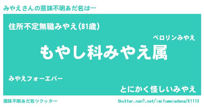 | 男性向けラノベタイトル風あだ名 | 『転生したらみやえだった件』 |