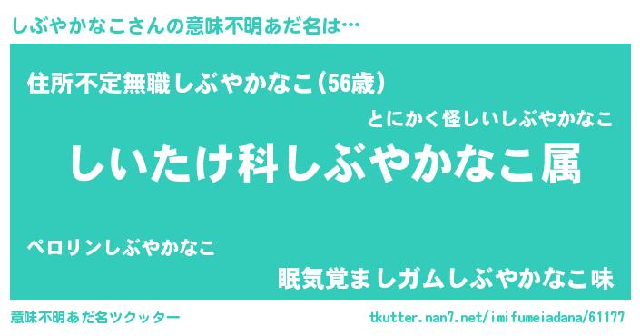 | 男性向けラノベタイトル風あだ名 | 『シブヤカナコスレイヤー』 |