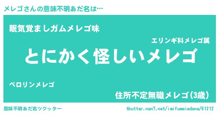 | 胡散臭い通販商品みたいなあだ名 | 『信頼と実績のサプリメント…その名も「メレゴ」』 |