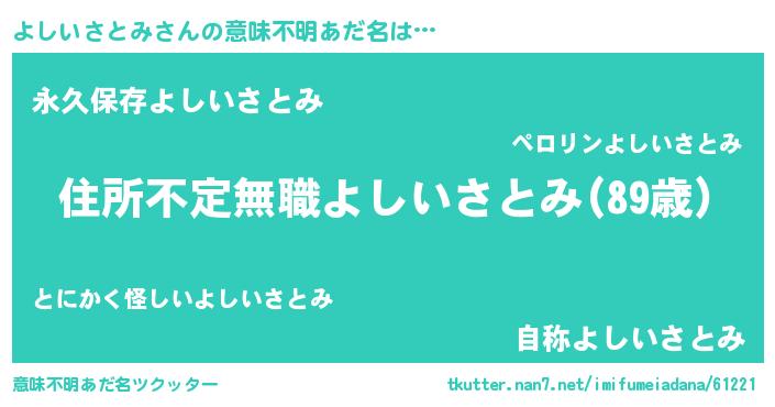 | 女子向けラノベタイトル風あだ名 | 『乙女ゲームの破滅フラグしかない悪役よしいさとみに転生してしまった…』 |