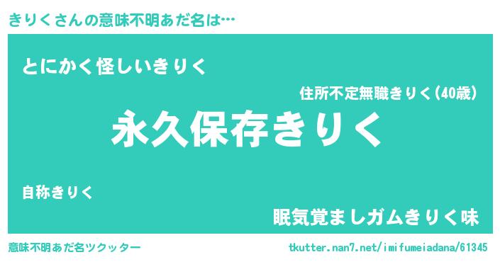 | ヘコむあだ名 | 『きりく(爆)』『きりお』『きりにー』 |